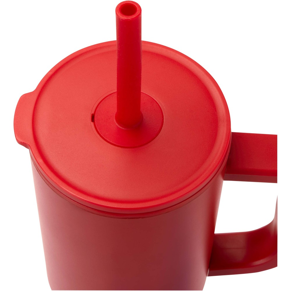 Strapabíró külső fallal rendelkező tumbler, amely RCS tanúsítvánnyal rendelkező újrahasznosított rozsdamentes acélból készült, belső fala pedig műanyag. Beépített, élelmiszeripari szilikon szívószállal és fröccsenésgátló, rányomható tetővel a kényelmes ivás érdekében. Meleg italokhoz is használható, de ezek fogyasztása szívószállal nem ajánlott. A forró italok hűtéséhez javasolt a tető eltávolítása. Űrtartalom: 900 ml. Kézi mosogatás javasolt.