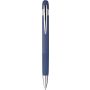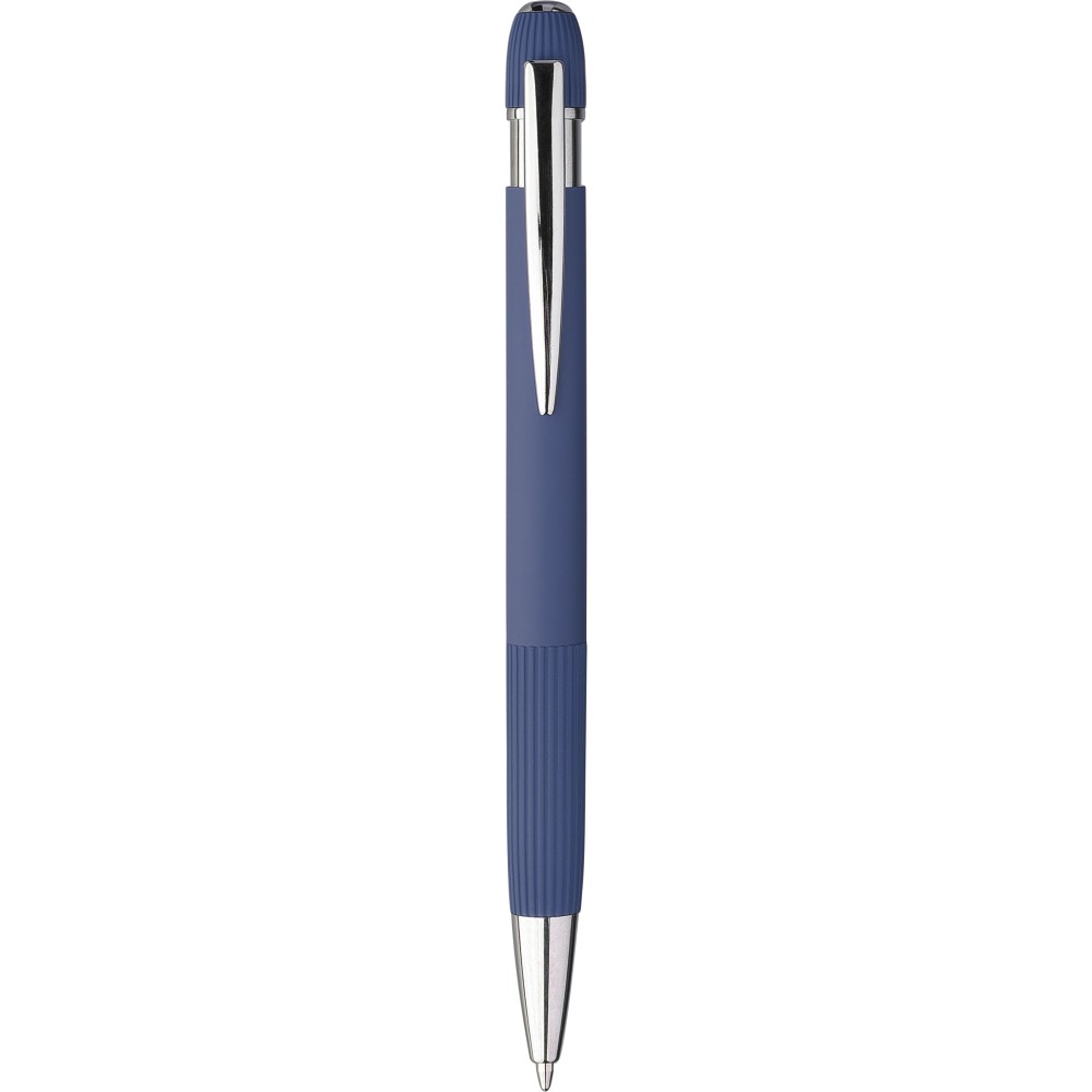 Újrahasznosított alumínium golyóstoll gumírozott felülettel. Csíkos részletekkel a markolaton és a tetején, krómozott műanyag heggyel és fém klipsszel ellátott nyomógombbal. Lézergravírozott újrahasznosított logóval. Kék tintával.