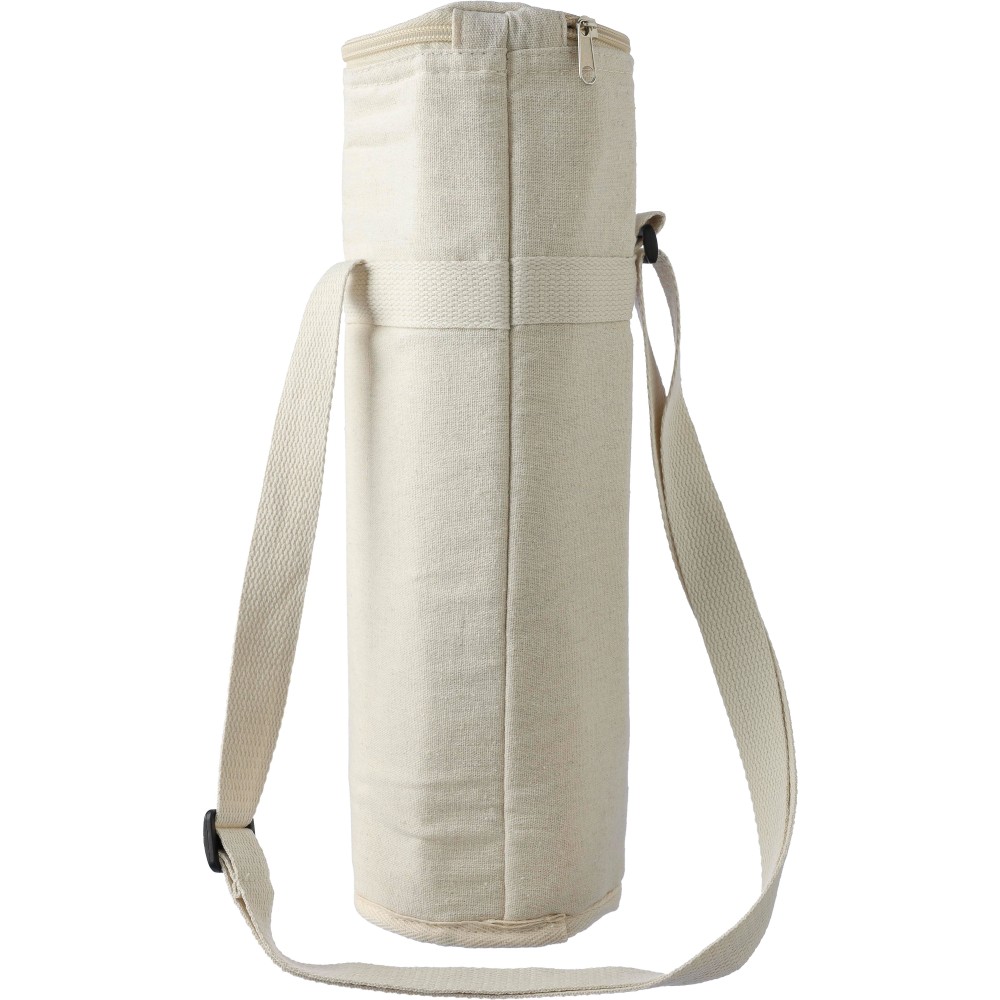Palackhűtő táska cipzáras záródással, belsejében 2 mm EPE és 12C PEVA béléssel. Hosszú, állítható hordozópánttal. Kapacitás: 1,5 literes palack. Az oldalon újrahasznosított pamut anyagra utaló címkével. Anyaga: újrahasznosított pamut 270 g/m2.