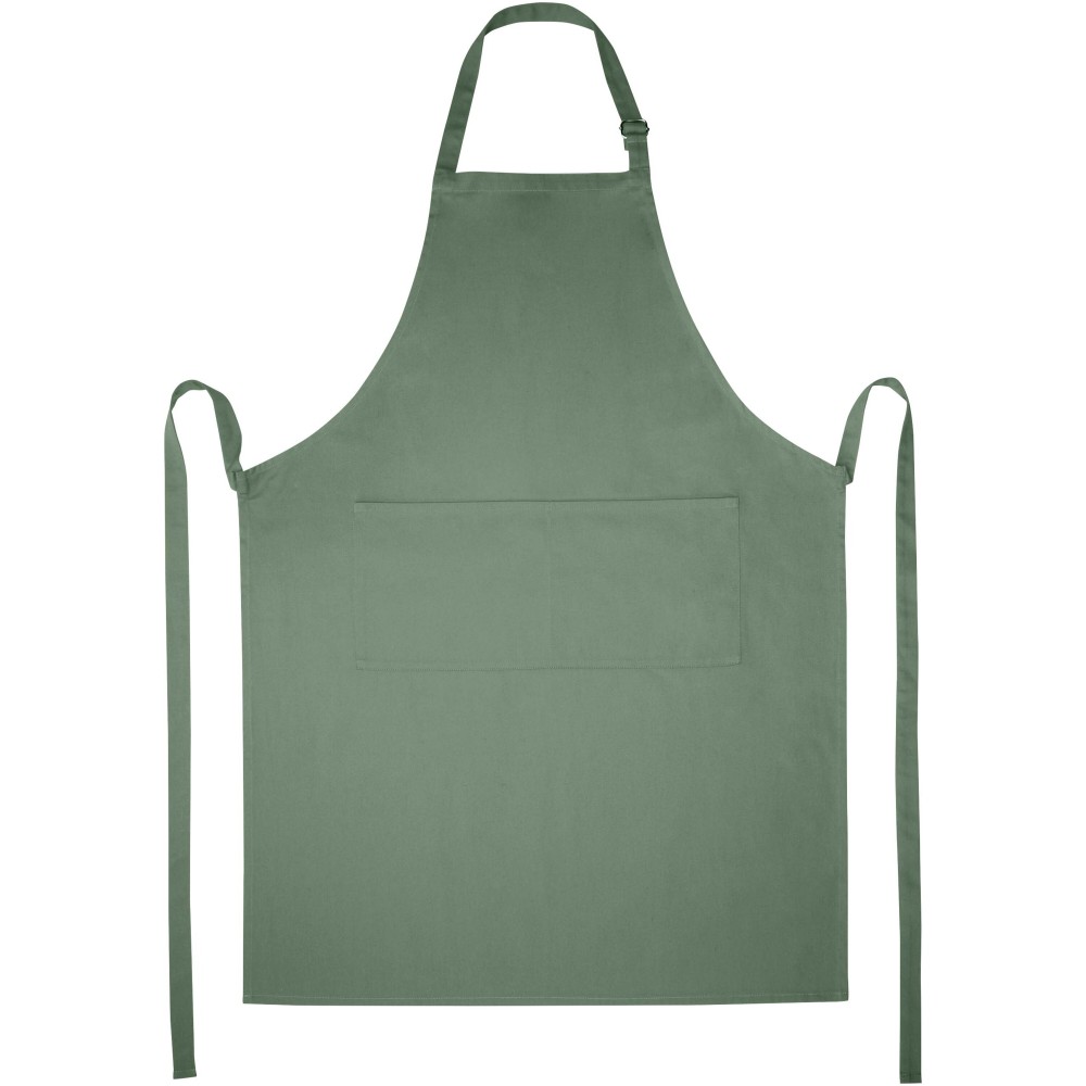 Vastag és masszív anyag, ugyanakkor puha és kényelmes viselet. A két elülső zseb gyors és egyszerű módot kínál a konyhai eszközök tárolására. A kötény nyakában csattal állítható, hátul megköthető. Nagyméretű nyomtatási lehetőség a logók megjelenítéséhez. Pamut twill 65% poliészterből és 35% pamutból, 240 g/m2.