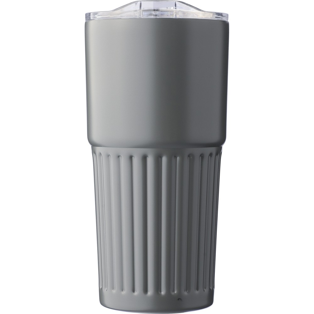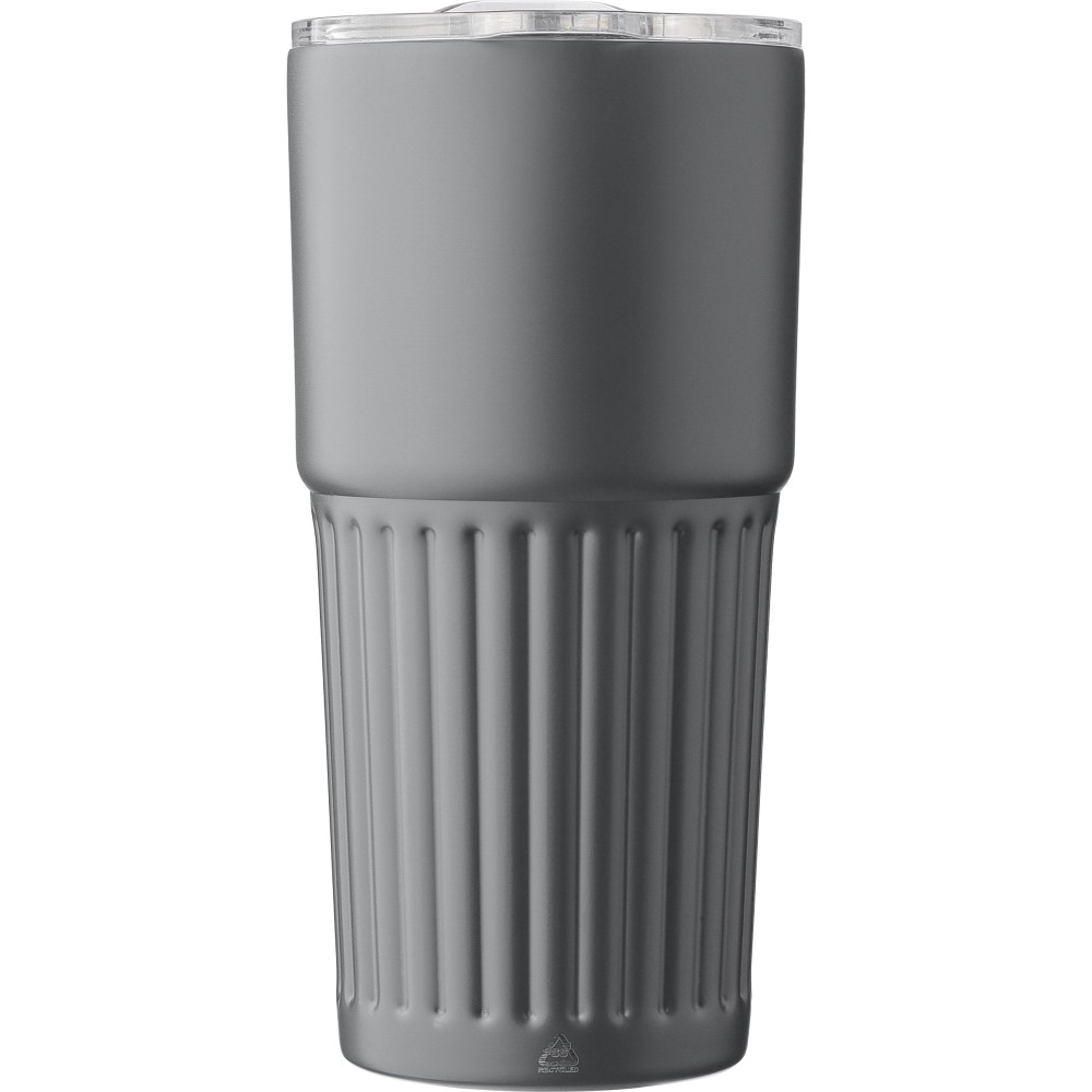 Újrahasznosított rozsdamentes acél útibögre, 450 ml. A belső 304-es, a külső 201-es rozsdamentes acélból készült, bordás markolattal, műanyag, csúszózáras fedéllel. Gravírozott újrahasznosított logó található a bögrén. Csomagolása barna papírdoboz.