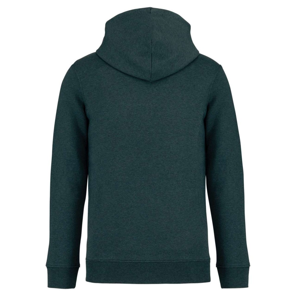85 % bio, fésült pamutból és 15 % újrahasznosított poliészterből készült. Unisex. Egyenes szabás. Méretcímke organikus pamut és újrahasznosított poliészter logóval. LSF (Low Shrinkage Fleece: előzsugorított polár) kezelés. Kapucni. 1x1 bordás szegély és kézelő. Duplatűzés a kézelőn, a szegélyen és a nyaknál. Szalagozott nyakbelső hátul. Bélelt kapucni, a nyaknyíláson nincs felülvarrás, csak egy megkötés, hogy a húzózsinór a felső részen maradjon. Kerek húzózsinór a kapucnin fém véggel. Kenguru zseb. Nincs márkajelzés a nyakrészen, csak egy méretcímke a könnyű dekorálás érdekében. Karton függőcímkével érkezik, amely felsorolja a termék előállításához felhasznált környezetbarát anyagokat. Organikus pamutfonal. OEKO-TEX N CQ1007/7 STANDARD 100 tanúsítvánnyal rendelkezik. IFTH. 350 g/m2.
