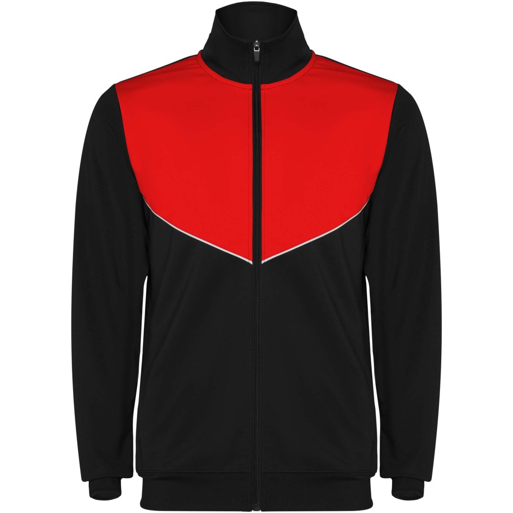 Könnyű és rugalmas anyagból készült melegítő. A végig cipzáros felső kontrasztos színű és varrású díszítésekkel dekorált a mellrészen. Oldalzsebek. Bordázott ujj- és és derékpasszé. Nadrág gumis derékkal és húzózsinórral, kontrasztos oldalsó varrással. Cipzáras szegély.