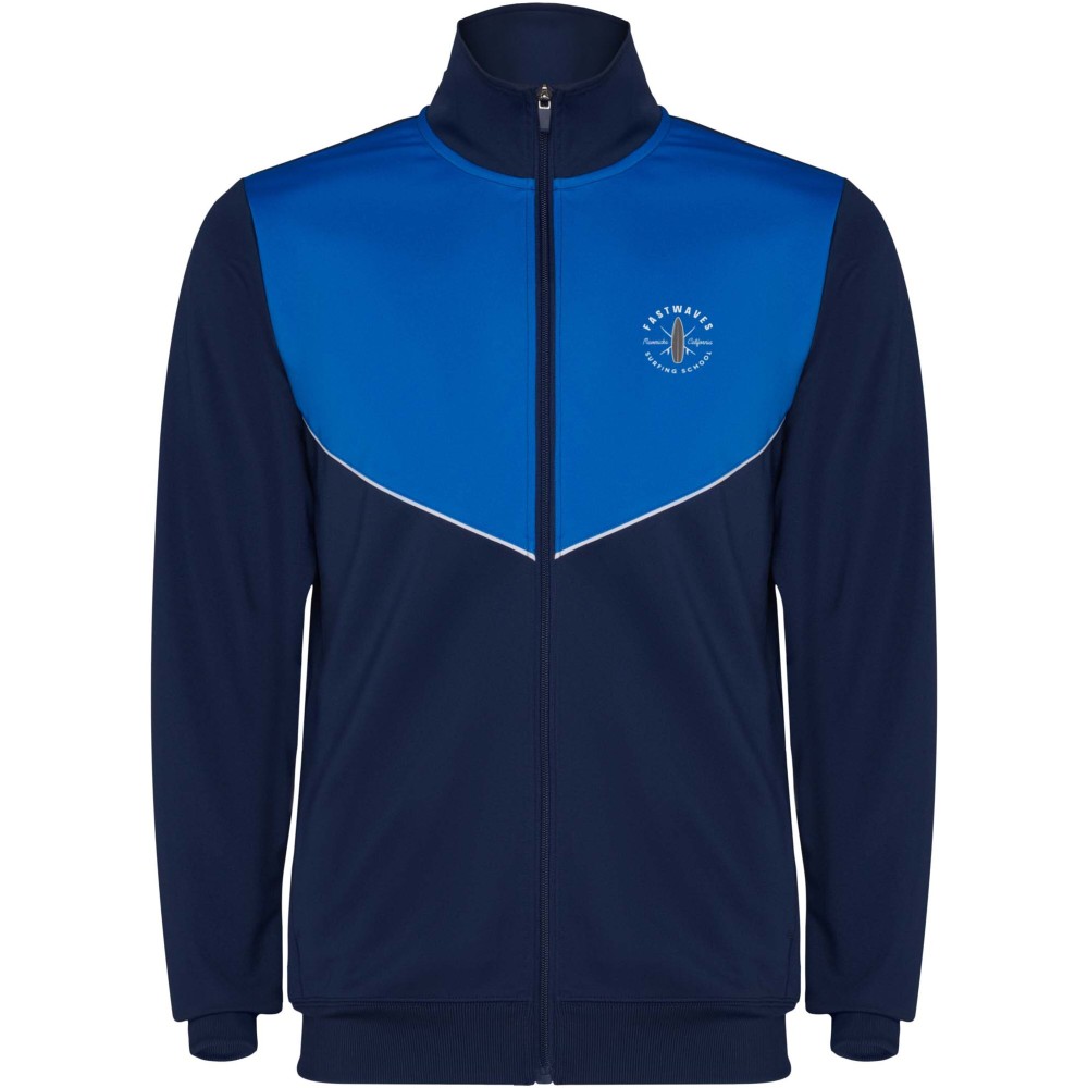 Könnyű és rugalmas anyagból készült melegítő. A végig cipzáros felső kontrasztos színű és varrású díszítésekkel dekorált a mellrészen. Oldalzsebek. Bordázott ujj- és és derékpasszé. Nadrág gumis derékkal és húzózsinórral, kontrasztos oldalsó varrással. Cipzáras szegély.