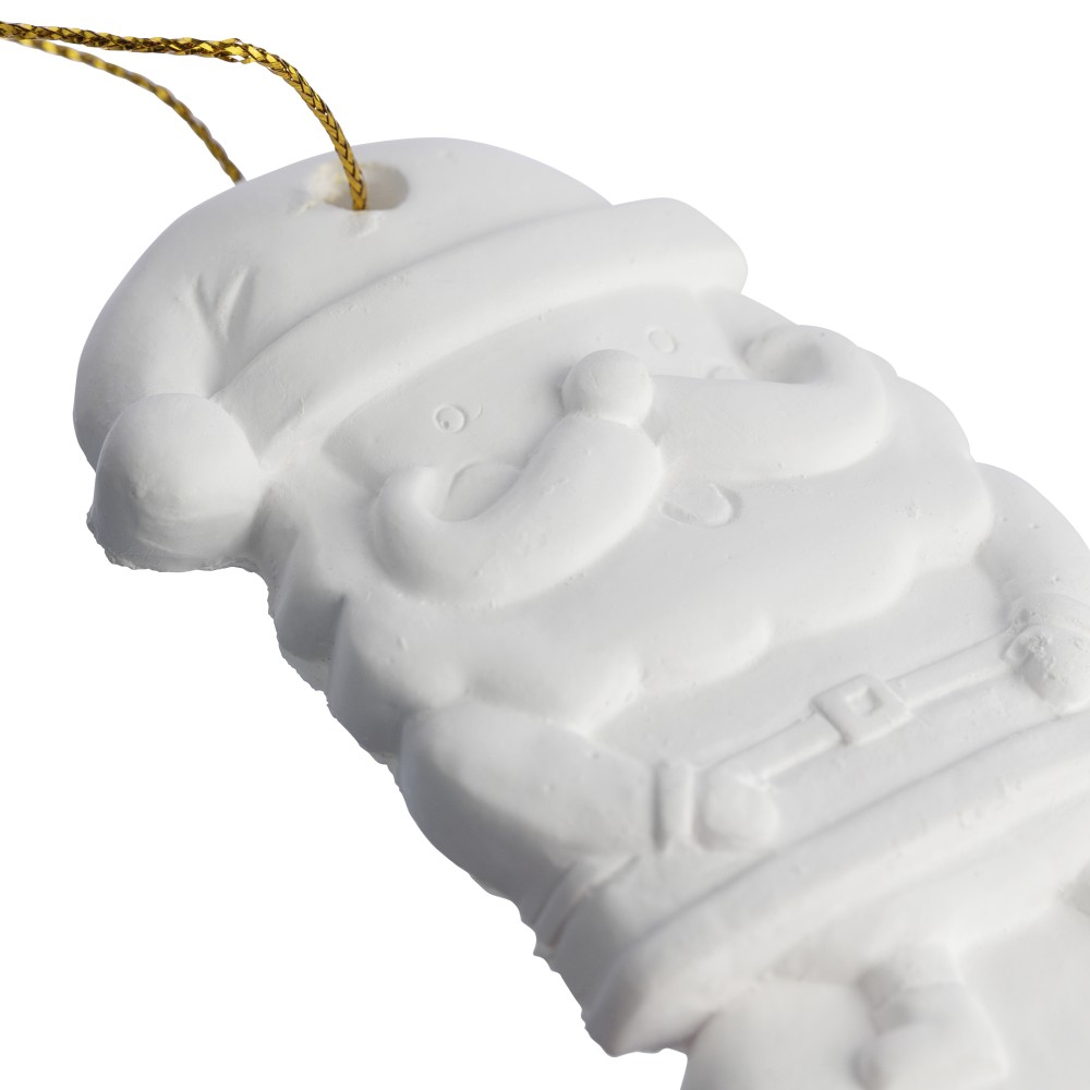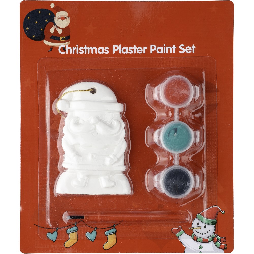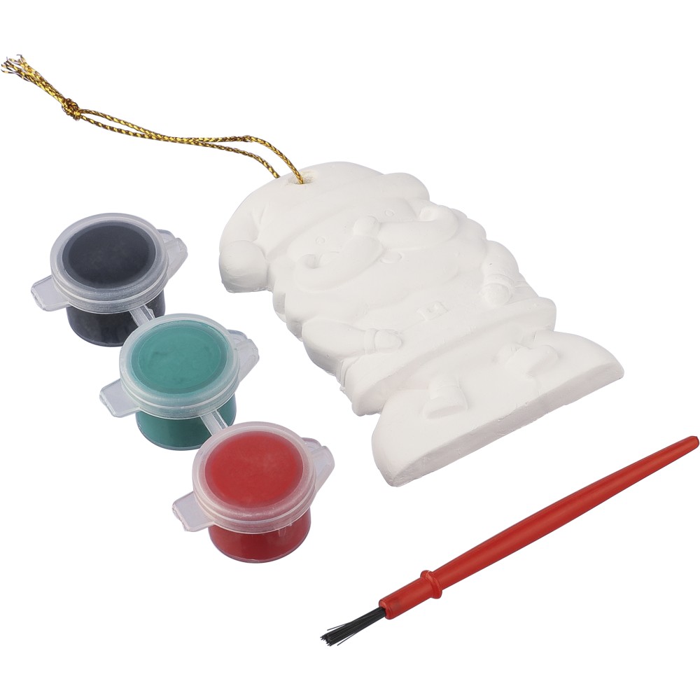 Mikulás festőkészlet, amely tartalmaz egy gipszfigurát, három különböző színű akrilfestéket és egy ecsetet. A figurát a rajta található lyukon keresztül poliészter zsinórral lehet karácsonyfadíszként felakasztani.