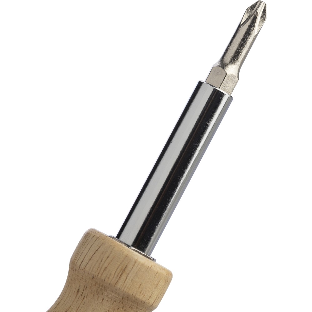Kaucsukfa csavarhúzó készlet a nyélben tartható 4 db mágneses fejjel (2-2 db mindegyik kétoldalas hegyen). Praktikus és kompakt kialakítás cserélhető fejekkel és tartóval. Csomagolása barna papírdoboz.